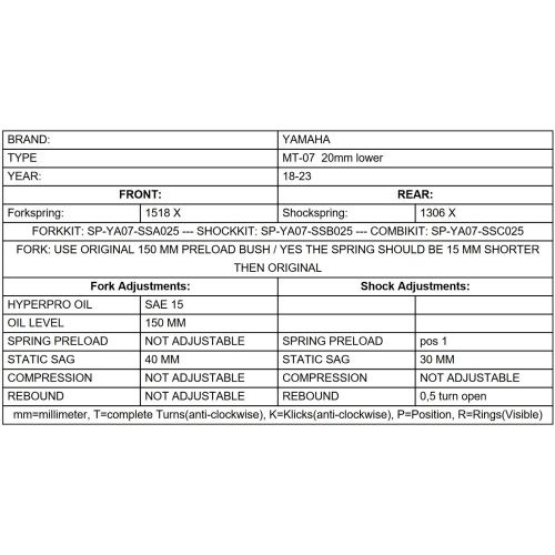 Touratech Suspension lowering kit -20mm for Yamaha MT-07 (USA: FZ-07) 2018 - 2023