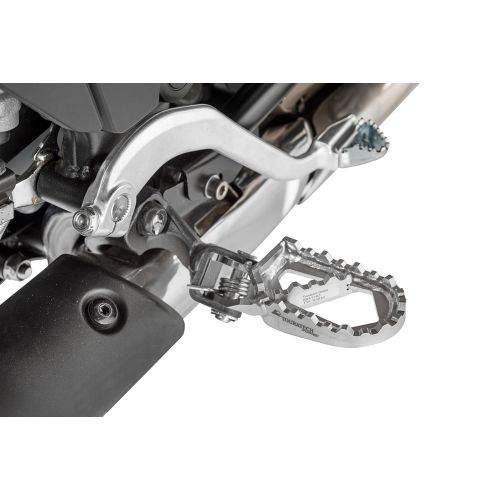 Тонкая конструкция и скругленный вверх внешний край подножки позволяют увеличить высоту клиренса, что является значительным преимуществом во время поездок по длинным и глубоким колеям по сравнению с обычными подножками мотоциклов эндуро и стандартными изделиями. Монтажные крепления модели Works были усилены, обеспечивая максимальную устойчивость к механическому воздействию. Кроме того, подножка очень хорошо смотрится. Нержавеющая сталь, прошедшая пескоструйную